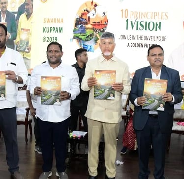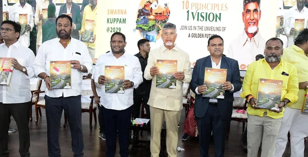 కుప్పం నియోజకవర్గంలో రెండు రోజులపాటు పర్యటిస్తున్నారు ముఖ్యమంత్రి నారా చంద్రబాబు నాయుడు. ఈ సంధర్భంగా ద్రవిడ యూనివర్సిటీలో స్వర్ణ కుప్పం విజన్ 2029 డాక్యుమెంట్ను సీఎం చంద్రబాబు ఆవిష్కరించారు. ఐదేళ్లలో కుప్పం నియోజకవర్గ అభివృద్ధికి సంబంధించి పవర్ పాయింట్ ప్రజెంటేషన్ ద్వారా ముఖ్యమంత్రి వివరించారు. రాష్ట్రానికి ముఖ్యమంత్రిని అయినా కుప్పం నియోజకవర్గానికి మాత్రం ఎమ్మెల్యేనే అని ముఖ్యమంత్రి నారా చంద్రబాబు నాయుడు అన్నారు. 8 సార్లు ఎమ్మెల్యేగా గెలిపించి ఆదరించిన కుప్పం ప్రజల రుణం ఎప్పటికీ తీర్చుకోలేదన్నారు. గత పాలకులు కక్షపూరితంగా కుప్పం అభివృద్ధిని అడ్డుకున్నారని, టీడీపీ కార్యకర్తలను ఇబ్బందులపాలు చేశారని ఆవేదన వ్యక్తం చేశారు. ఇకపై కుప్పం అభివృద్ధి అన్ స్టాపబుల్ అని, అన్ని రంగాల్లో నియోజకవర్గాన్ని ముందుకు తీసుకువెళ్లేందుకే స్వర్ణ కుప్పం విజన్ 2029 నిర్ధేశించుకున్నామని ముఖ్యమంత్రి చెప్పారు. కుప్పంలోని ద్రవిడ యూనివర్సిటీలో స్వర్ణ కుప్పం విజన్ 2029 డాక్యుమెంట్ ను ముఖ్యమంత్రి చంద్రబాబు సోమవారం(జనవరి 6) ఆవిష్కరించారు. ఐదేళ్లలో కుప్పం నియోజకవర్గ అభివృద్ధికి సంబంధించి పవర్ పాయింట్ ప్రజెంటేషన్ ద్వారా ముఖ్యమంత్రి వివరించారు. 2024 అసెంబ్లీ ఎన్నికల తర్వాత రెండోవసారి కుప్పం నియోజకవర్గంలో అడుగుపెట్టారు సీఎం చంద్రబాబు. ఇప్పటికే కుప్పం విజన్ 2029లో భాగంగా స్పెషల్ ఆఫీసర్ నియమించి కుప్పం ఏరియా డెవలప్ మెంట్ అథారిటీ ఏర్పాటు చేసినట్లు తెలిపారు. కుప్పంలో ఉన్న 65 వేల కుటుంబాల్లో ప్రతి కుటుంబాన్ని ఒక యూనిట్గా, ఇంటికో ఇంటికి పారిశ్రామికవేత్తను తయారుచేస్తామన్నారు. కుప్పం నియోజకవర్గంలో పేదరికం లేకుండా ఉండేందుకు ప్రతి కుటుంబాన్ని ఆర్థికంగా అభివృద్ధి చేస్తామన్నారు. పెద్ద ఎత్తున పరిశ్రమలు స్థాపించి 15 వేల ఉద్యోగాల కల్పన,100 శాతం సోలరైజేషన్, రహదారుల నిర్మాణం, జనాభా పెరుగుదలకు ప్రోత్సాహకాలు, నైపుణ్య శిక్షణా కేంద్రాల ఏర్పాటు, కార్గో ఎయిర్ పోర్టు పూర్తిచేయడం, వ్యవసాయాన్ని లాభసాటిగా మార్చడం, 100 శాతం మరుగుదొడ్లు నిర్మాణం, అర్హులకు పెన్షన్లు, దీపం పథకం ద్వారా గ్యాస్ సిలిండర్లు పంపిణీ, సూపర్ స్పెషాలిటీ ఏరియా ఆస్పత్రి నిర్మాణం, జలజీవన్ మిషన్ ద్వారా ప్రతి ఇంటికీ సురక్షిత నీరు, ఎలక్ట్రికల్ సైకిళ్లు పంపిణీ, డ్వాక్రా మహిళలకు ప్రోత్సాహకాలు అందించి కుప్పం నియోజకవర్గాన్ని మోడ్రన్, టూరిజం హబ్ గా తయారు చేయడం వంటి నిర్ధిష్ట ప్రణాళికతో స్వర్ణ కుప్పం విజన్ – 2029 రూపొందించామని ముఖ్యమంత్రి చంద్రబాబు తెలిపారు. నాడు విజన్-2020 అని నినాదం ఇస్తే కొంతమంది హేళన చేశారన్న చంద్రబాబు.. 1995లో సీఎంగా బాధ్యతలు చేపట్టాక, రాళ్లు, రప్పలు ఉన్న సైబరాబాద్ ప్రాం